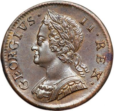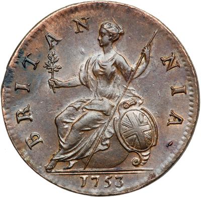 Great Britain. Halfpenny, 1753. S.3719; KM-579.2. George II, 1727-1760. Draped bust of King left. Reverse: Britannia holding pole. Tiny trace of luster. NGC graded MS-63 Brown.