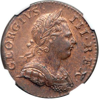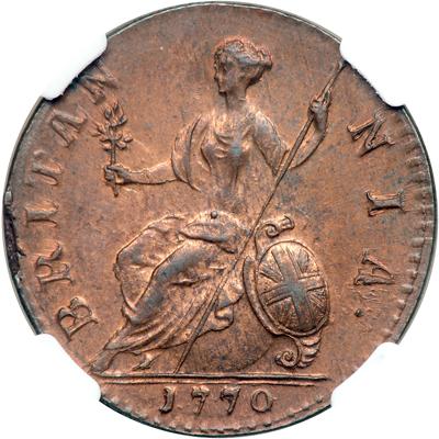Great Britain. Halfpenny, 1770. S.3774; KM-601. George III, 1760-1820. Obverse: Laureate and cuirassed bust of King right. Reverse: Britannia with shield and pike. Date in exergue. An abundance of original luster on this coin from the first year of George III's halfpenny issue. In a new 4 prong NGC holder. NGC graded MS-64 Red & Brown.