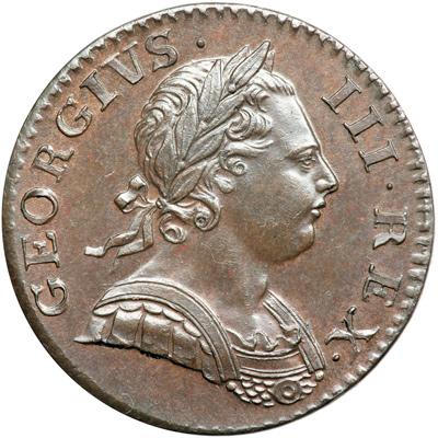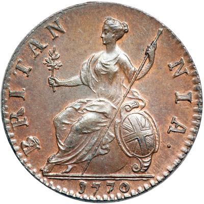 Great Britain. Halfpenny, 1770. S.3770. George III, 1760-1820. Laureate bust right. Reverse: Britannia. NGC graded MS-65 Brown.