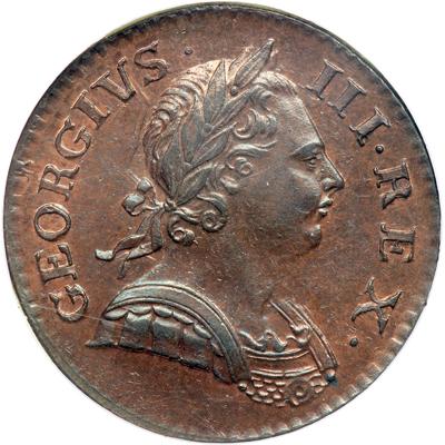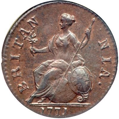 Great Britain. Halfpenny, 1771. S.3774; KM-601. George III, 1760-1820. Well struck bust with glossy reddish-brown surfaces and electric blue iridescent tone. Most attractive Nearly Gem Uncirculated and scarce this nice. NGC graded MS-64 Brown.