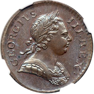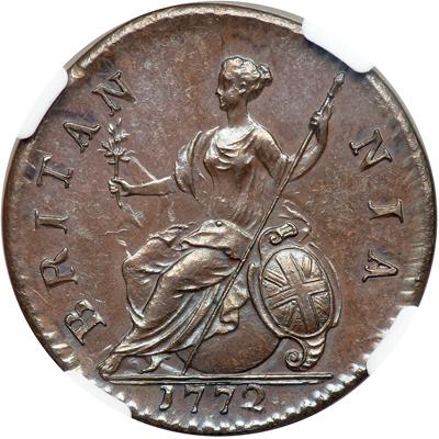 Great Britain. Halfpenny, 1772. S.3774; KM-601. George III, 1760-1820. Obverse: Laureate and cuirassed bust of King right. Reverse: Britannia with shield and pike. Date in exergue. This has all the crispness and sharp detail of a Proof coin. It certainly appears to have been produced on a large diameter, specially prepared blank with high rims. A tiny tinge of original mint red in the lettering. In a new 4 prong NGC holder. NGC graded MS-64 Brown.