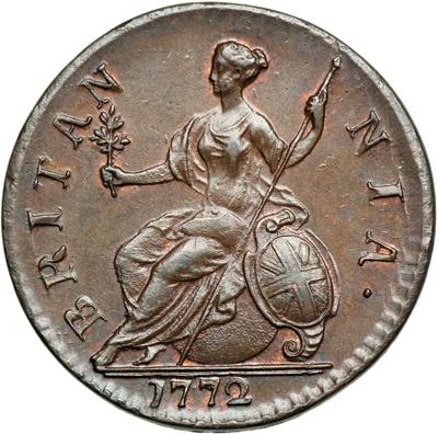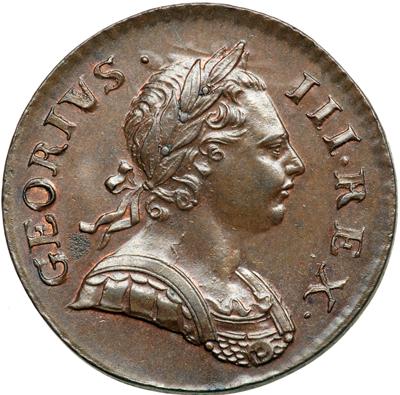 Great Britain. Halfpenny, 1772. S.3774; KM-601. George III, 1760-1820. GEORIVS (misspelled name of King) error. Obverse: Laureate draped bust of King right. Reverse: Britannia left holding olive branch. With traces of original luster, this is a spectacular example. The major obverse error was soon corrected and the GEORIVS halfpenny is difficult to find now in any grade. This must be one of the finest extant specimens. NGC graded MS-64 Brown.