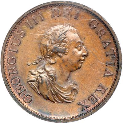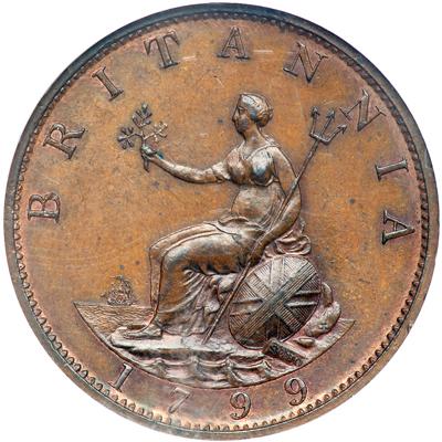 Great Britain. Halfpenny, 1799. S.3778. George III. Laureate and draped bust right. Reverse: Britannia left. NGC graded MS-64 Brown.
