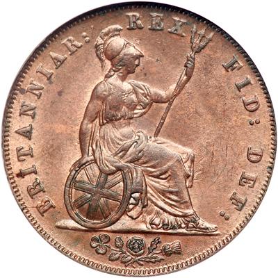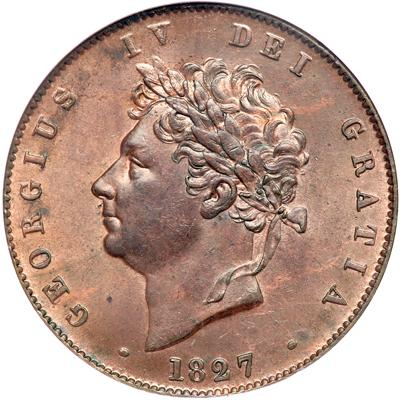Great Britain. Halfpenny, 1827. S.3824; KM-692. George IV. Laureate head left. Reverse: Britannia. NGC graded MS-63 Red & Brown.