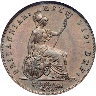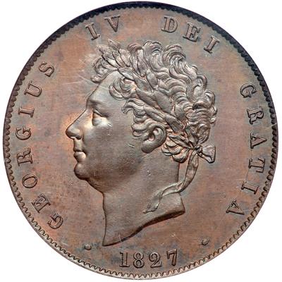 Great Britain. Halfpenny, 1827. S.3824; KM-692. George IV, 1820-30. Last year of a three year type. Well defined portrait with attractive mahogany color retaining traces of original mint red. NGC graded MS-63 Brown.