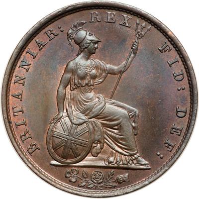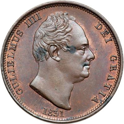 Great Britain. Halfpenny, 1831. S.3847; KM-706. William IV, 1830-1837. Obverse: Portrait of King right. Reverse: Britannia seated right with shield and trident. Lightly cleaned. So difficult to locate nice William IV copper coins now, this piece has some original color. Almost Uncirculated to Uncirculated.