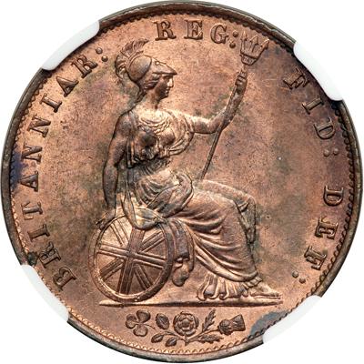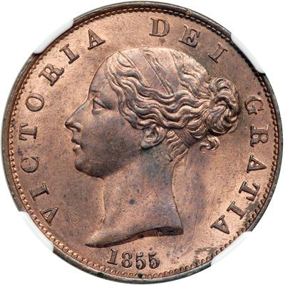Great Britain. Halfpenny, 1855. S.3949; KM-726. Victoria, 1837-1901. Obverse: Wyon's young portrait of Queen left. Reverse: Britannia with shield and trident. Lots of original luster and a nicely detailed piece. NGC graded MS-64 Red & Brown.