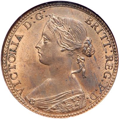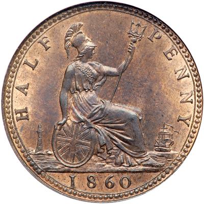 Great Britain. Halfpenny, 1860. S.3956; KM-748.2. Victoria. Beaded Borders. NGC graded MS-64 Red & Brown.