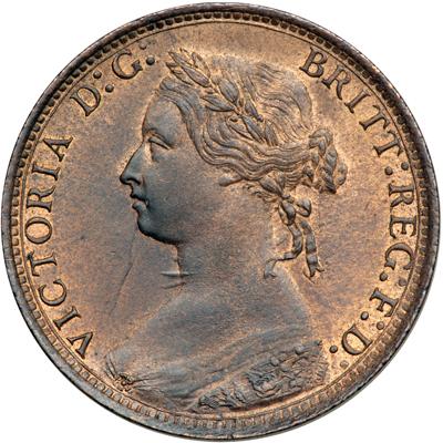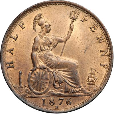 Great Britain. Halfpenny, 1876-H. S.3957; KM-754. Victoria, 1837-1901. Obverse: Young bust of Queen by L C Wyon left. Reverse: Britannia seated right. Most luster or mint red remains on the obverse, and full mint red on the reverse. A deceptively difficult date to buy in this grade. NGC graded MS-65 Red & Brown.