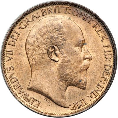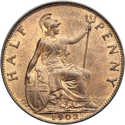 Great Britain. Halfpenny, 1902. S.3991A; KM-793.1. Edward VII, 1901-1910. Low tide. Obverse: Bare head of King facing right. Reverse: Britannia seated, date in exergue. Much rarer than the low tide variety penny of the same year, this halfpenny has virtually full mint red or luster. A rare coin indeed. NGC graded MS-64 Red & Brown.