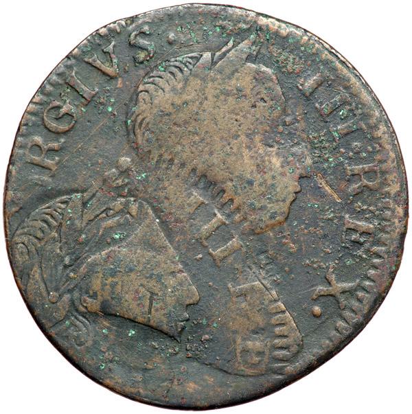 Great Britain. Halfpenny Double Struck Error, 1775. S.3774. George III, 1760-1820. Interesting mint error, clear details. Poor Condition. Also included are small group of low grade George II and George III Halfpennies (1 Irish, 5 English). Lot of 7 coins.