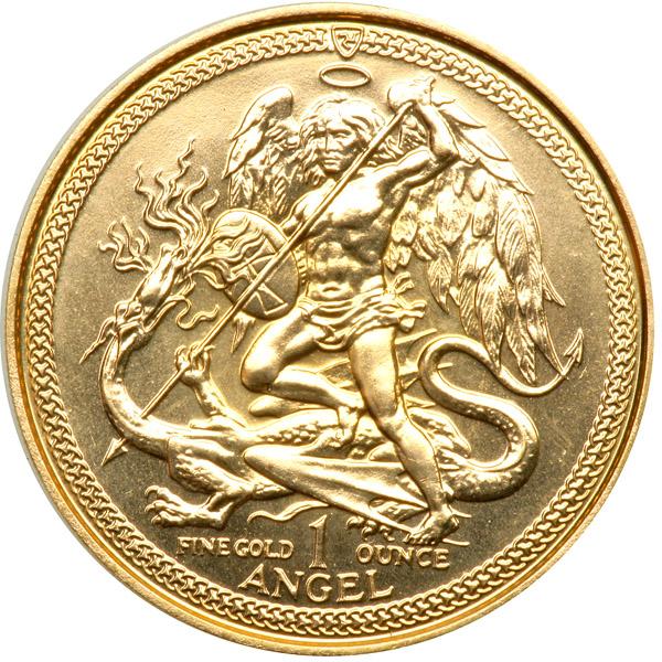 Isle of Man. Angel, 1985. Fr-28a; KM-141. Weight 1.0003 ounce. Elizabeth II. Reverse: Archangel Michael slaying dragon. Choice Brilliant Uncirculated.