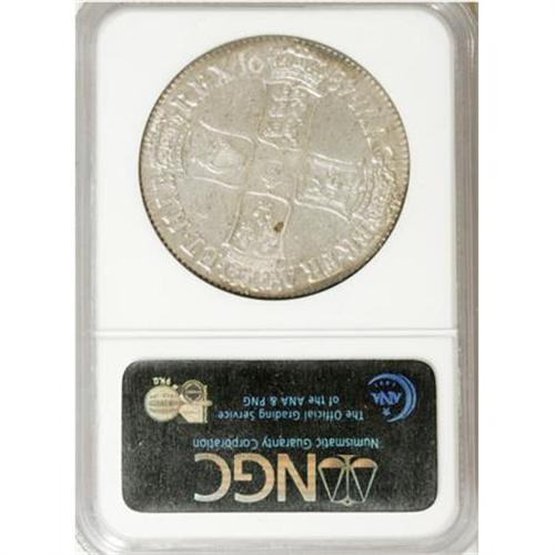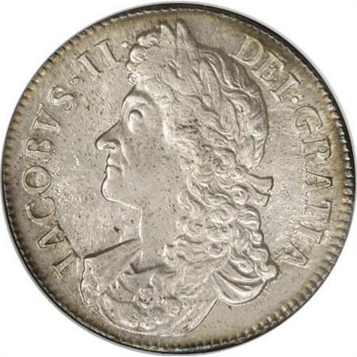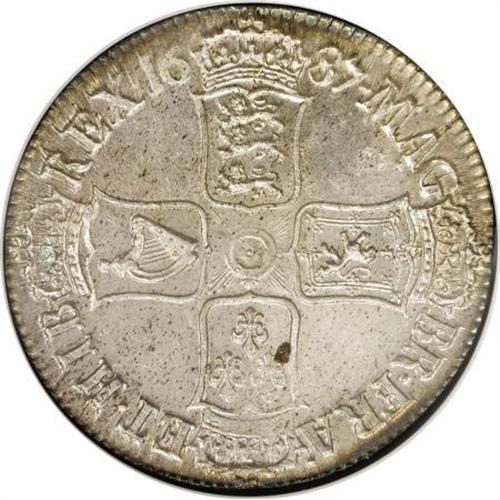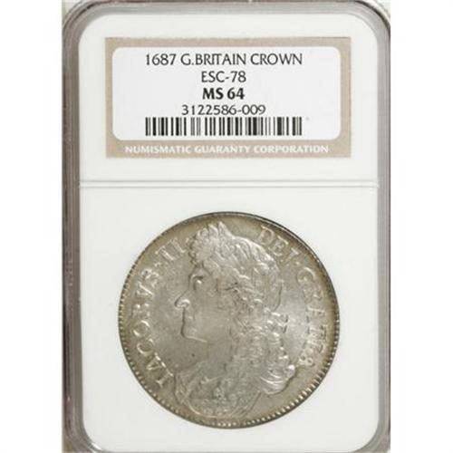 <B>James II Crown 1687,</B></I> S-3407, edge not visible, MS64 NGC, usual light strike on the king's hair and the wreath above his forehead, a sort of mushy strike in fact with flow lines showing and the tops of the date digits and some letters flowing as well, instead of sharp in detail, the surfaces silvery with lots of tiny haymarks and one notable black fleck on the shield among the Lis in that quadrant, the luster glowing and the surfaces remarkably nice. Very scarce as a type, moreso in this condition.<BR><BR><b>Shipping:</b> Coins & Currency (<a target="_blank" href="http://www.heritageauctions.com/common/shipping.php">view shipping information</a>)