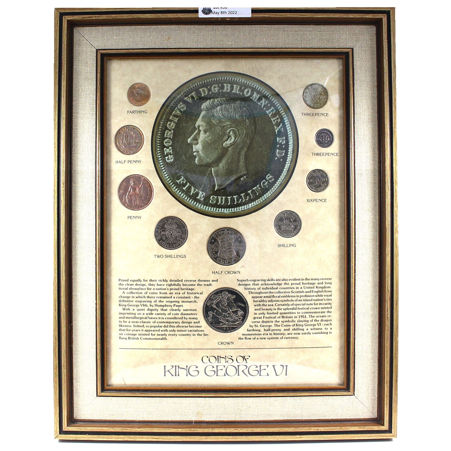 *Great Britain 'Coins of King George VI' 10-coin Set in Wooden Frame. The coins included are farthing, half penny, penny, 2x different three pence, six pence, shilling, two shillings, half crown & crown.