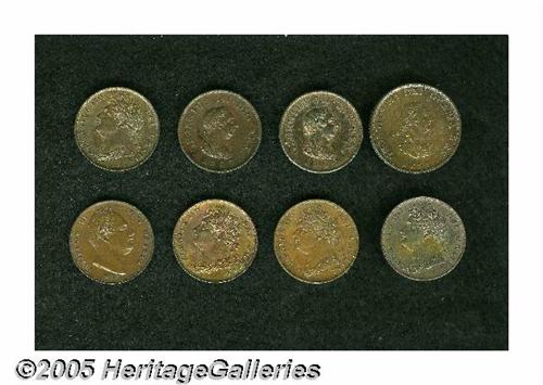 <B>Large George and William Farthing lot including:</B></I> 1799, AU-Unc; 1806, AU; 1807, XF; 1821, Choice AU; 1822, Choice AU; 1823, brown Unc; 1825, cleaned XF; and an 1837, Choice AU.