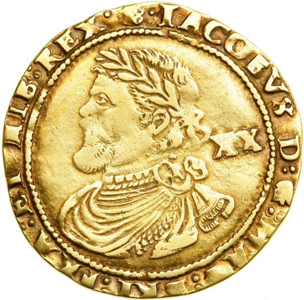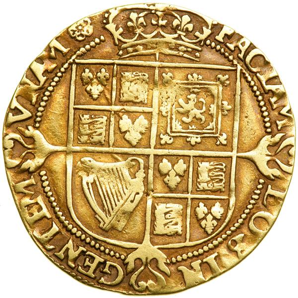 Great Britain. Laurel, ND. S.2638A; Fr-242. James I, 1603-1625. Third coinage. Mint mark, Rose. Laureate armored bust left, with value behind. Reverse: Long cross over square shield. Clipped and mount removed. NGC graded Very Fine, Details.