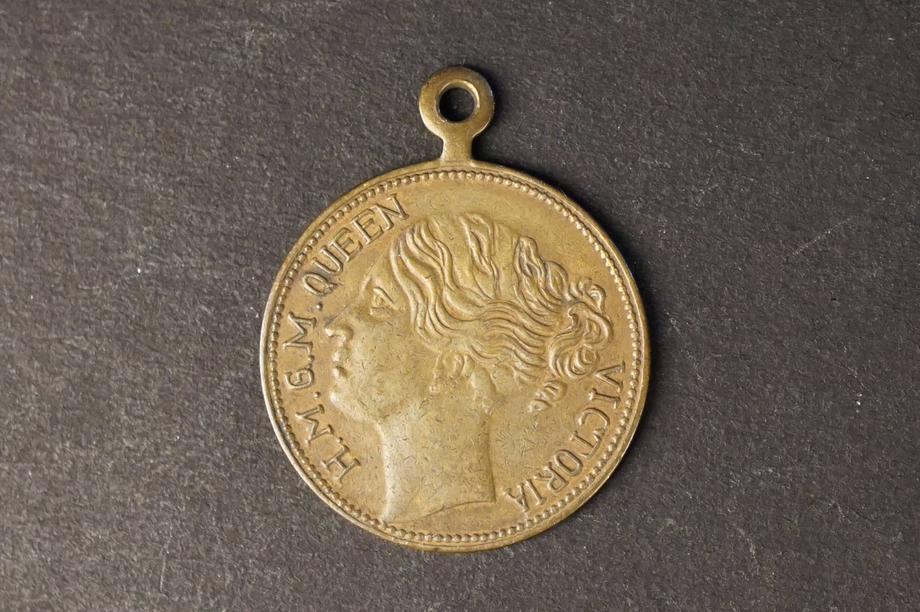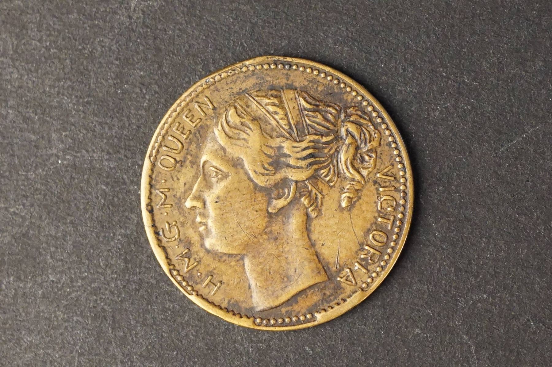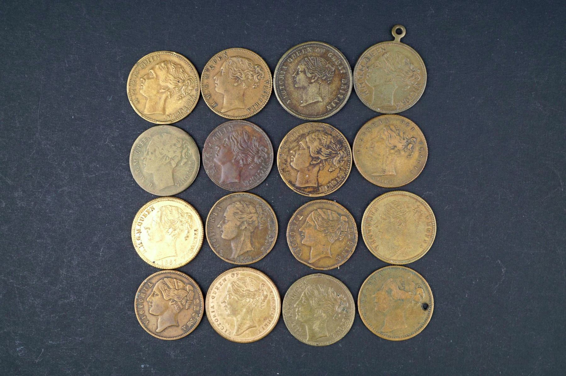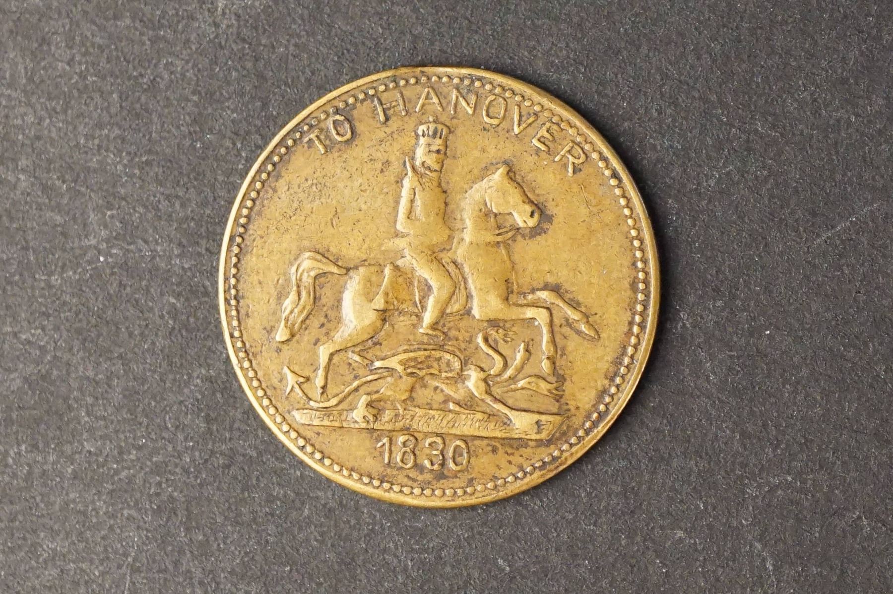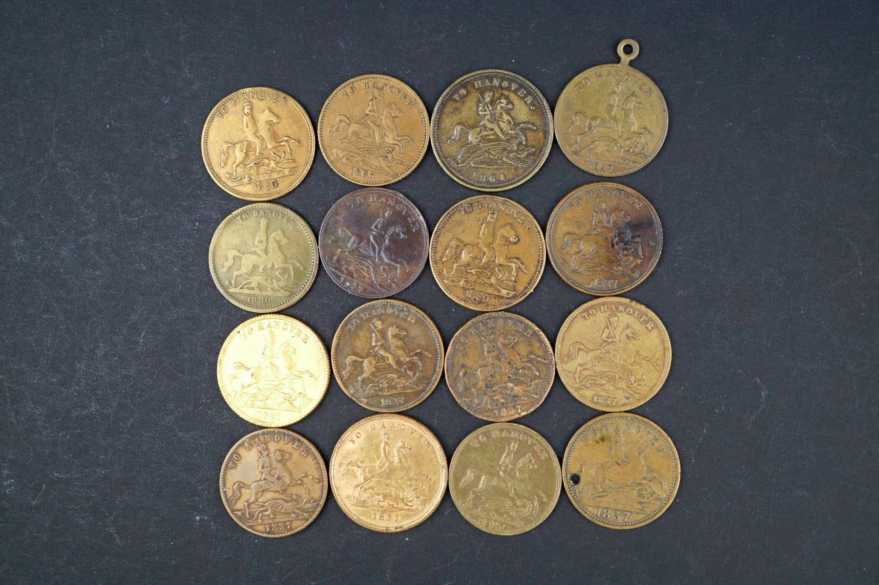 Mostly brassy bronze, two are gilt, 3 in red copper, 21-23 mm. 2.5 - 3.5 grams each, 12 pieces dated 1837, 3 are 1830, 1, the largest, is dated 1864. One is pierced, one has an integral loop. Conditions vary from VG to AU. All have the head of Victoria, left.Titles vary, VICTORIA QUEEN OF GREAT BRITAIN, or H.M.G.M. QUEEN VICTORIA or VICTORIA DEI GRATIA. The common reverse features a man on horseback, sometimes carrying a sword, the horse jumping over a creature with three snake heads. The date is in the exergue. On top: TO HANOVER. These political pieces were produced in large numbers, mostly at the accession of Queen Victoria. As the new queen had lost possession of the family territories in Germany due to their laws insisting on male rule, there was a popular movement to retake these lands, by force, if necessary.