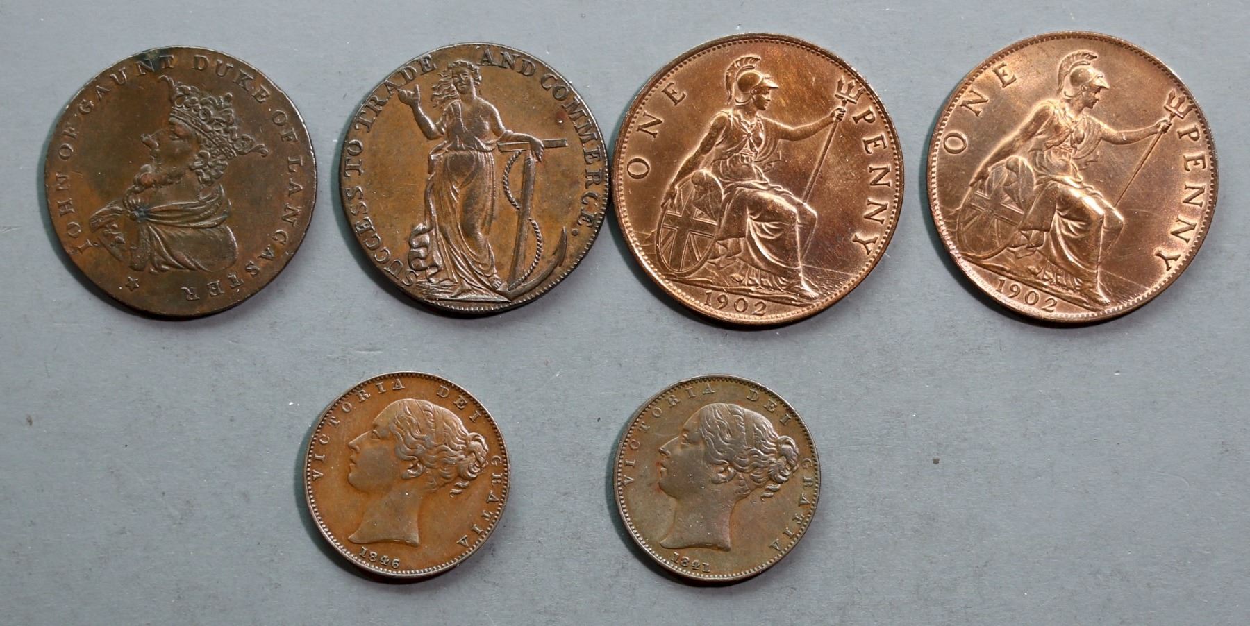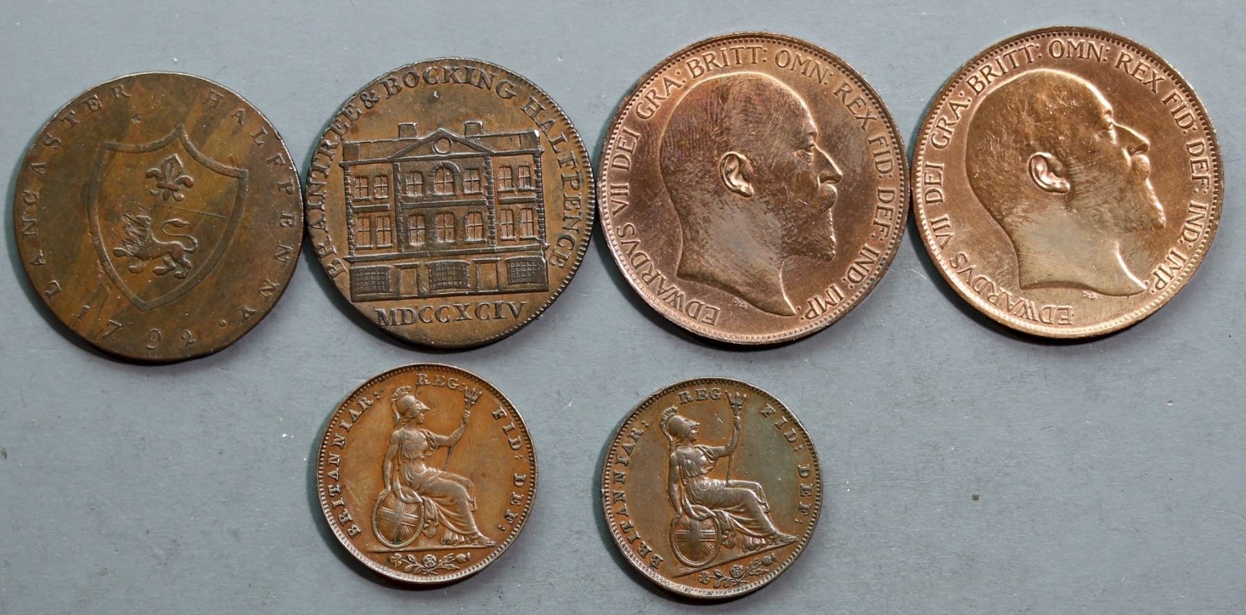Great Britain; Lot of 6 various coins and tokens. Grades vary.