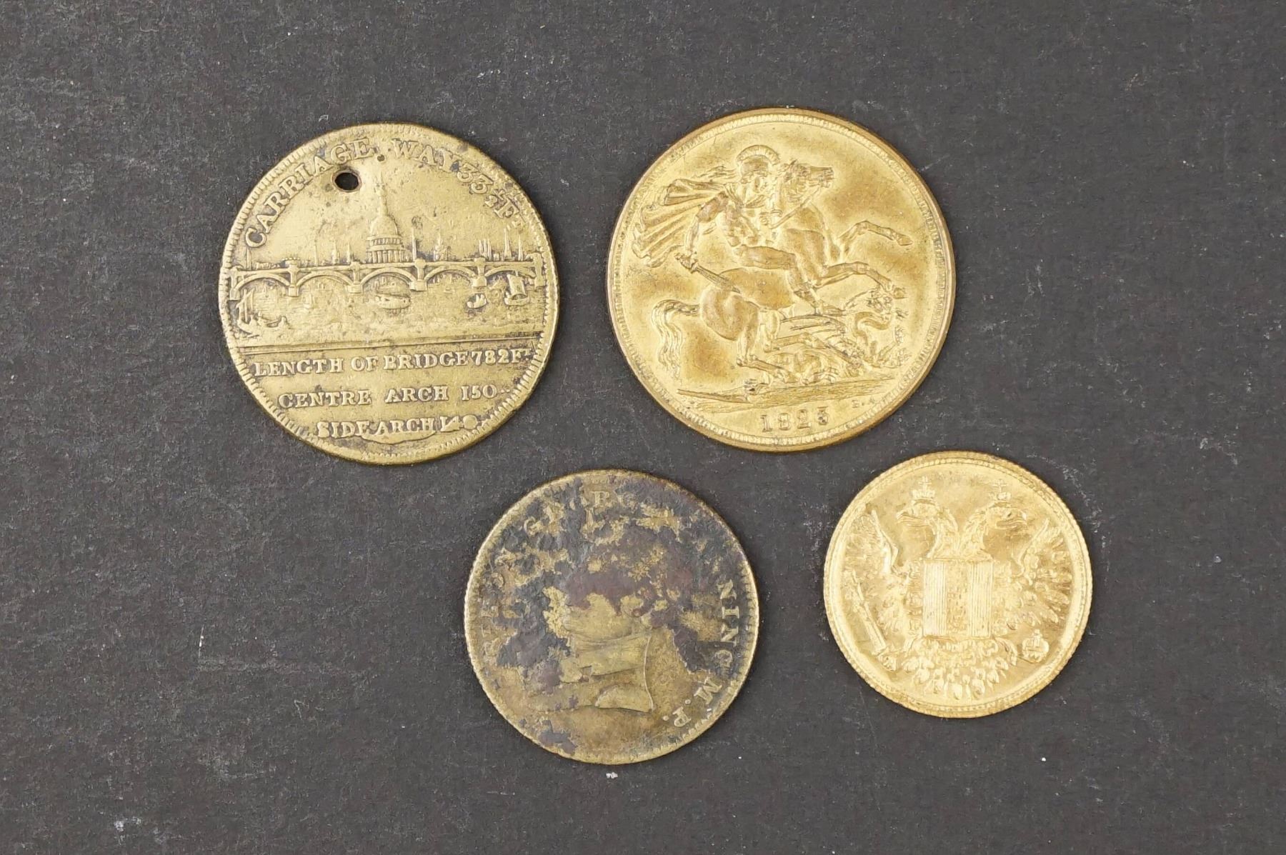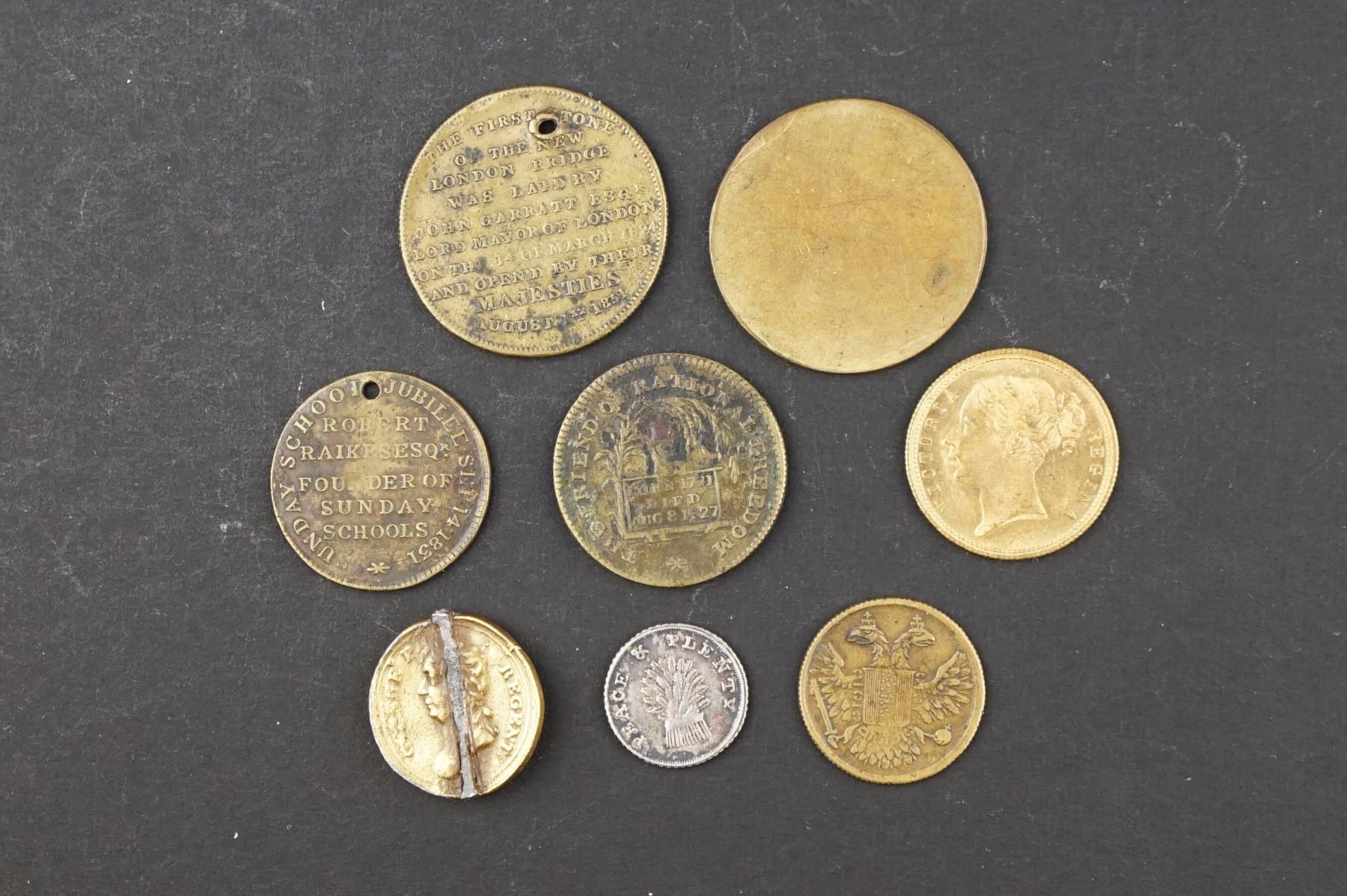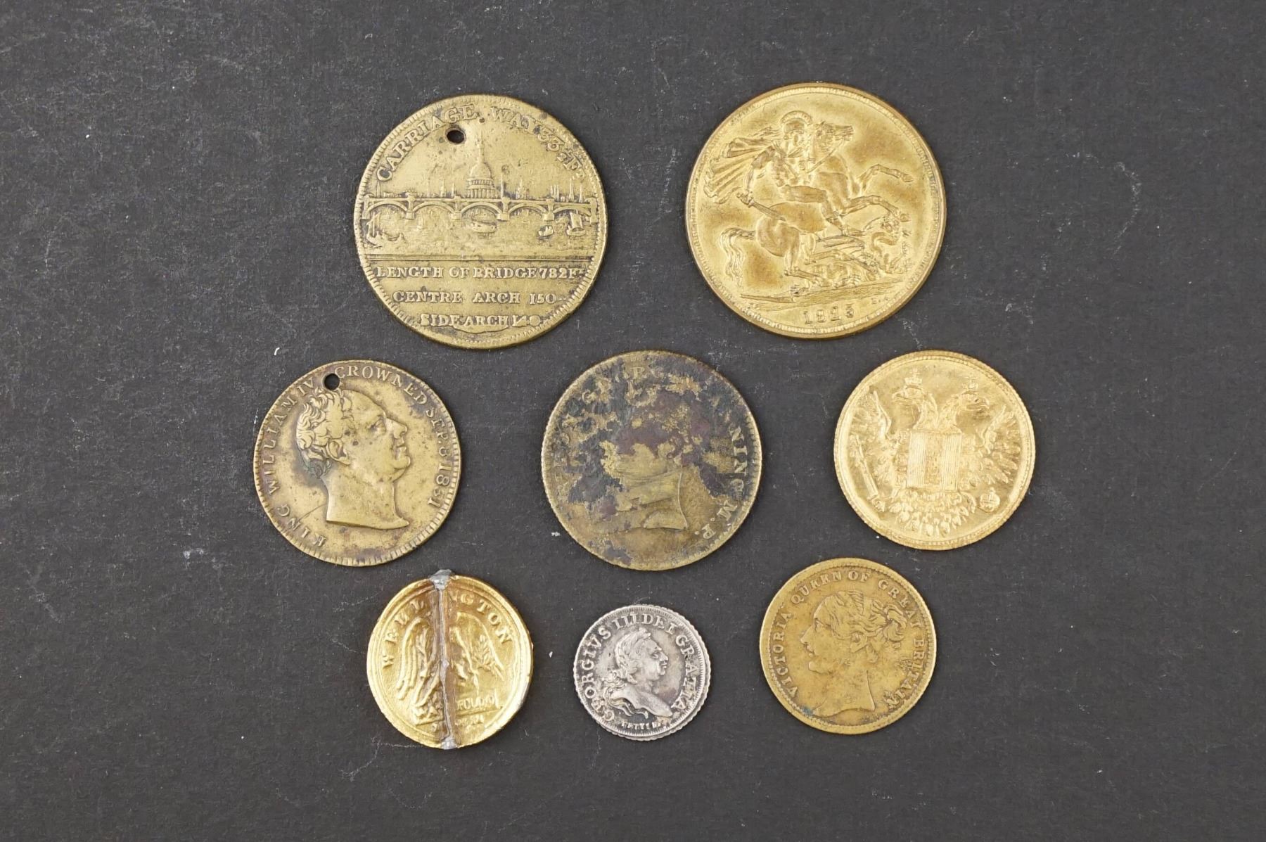1) Appears to be silver, 15 mm, 1.5 grams.GEORGIVE III DEI GRARIA Bust right Signature below bust, hard to read, perhaps PETTE? Reverse: PEACE & PLENTY around a basket of corn, VF. 2) Bronze medalet 24 mm, 5,4 grams. 1827 George Canning, Prime Minister, memorial. VG. 3) Brass, 28 mm, 6.8 grams. Pierced. Opening of London Bridge 1851. 4)Bronze 19 mm, 1.7 grams. Obv: Queen Victoria. Rev: Habsburg Eagle Spiel market? F-VF. 5) Brass, 24 mm, 5.5 grams, Uniface, copy of the reverse of a double sovereign, with date of 1823. 6) Another Victoria? Habsburg Eagle Brass, 19 mm, 1.7 grams, BU. 7) Bronze, 23 mm. 3.4 grams, pierced. Obverse: Bust of William IV 1831. Reverse: Robert Raikes, founder of Sunday Schools. 8) 20mm 4.5 gr, copy of Waterloo medal gilt copper Bars soldered both sides.
