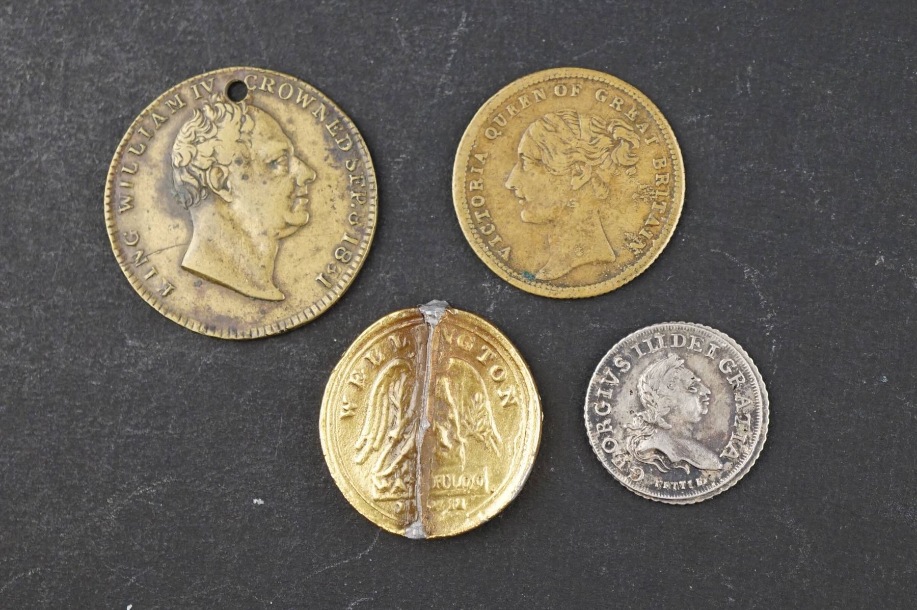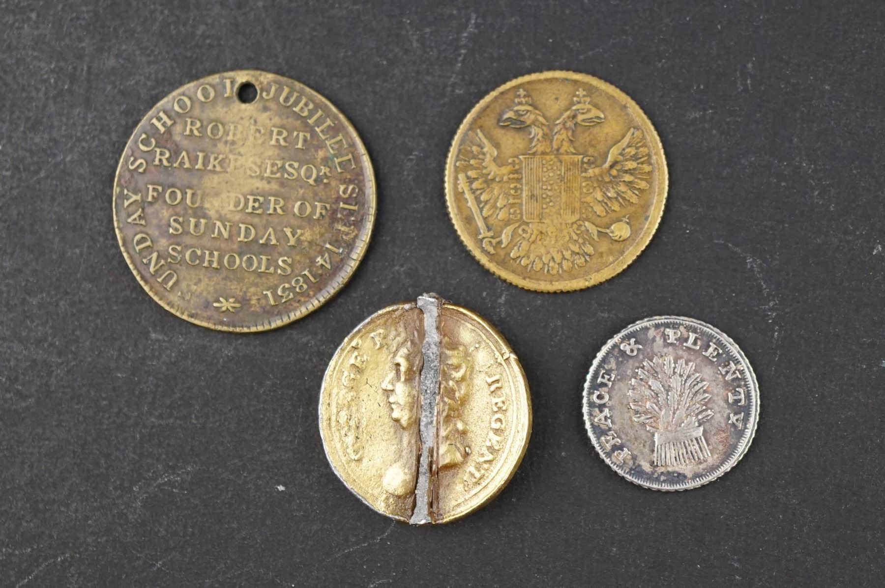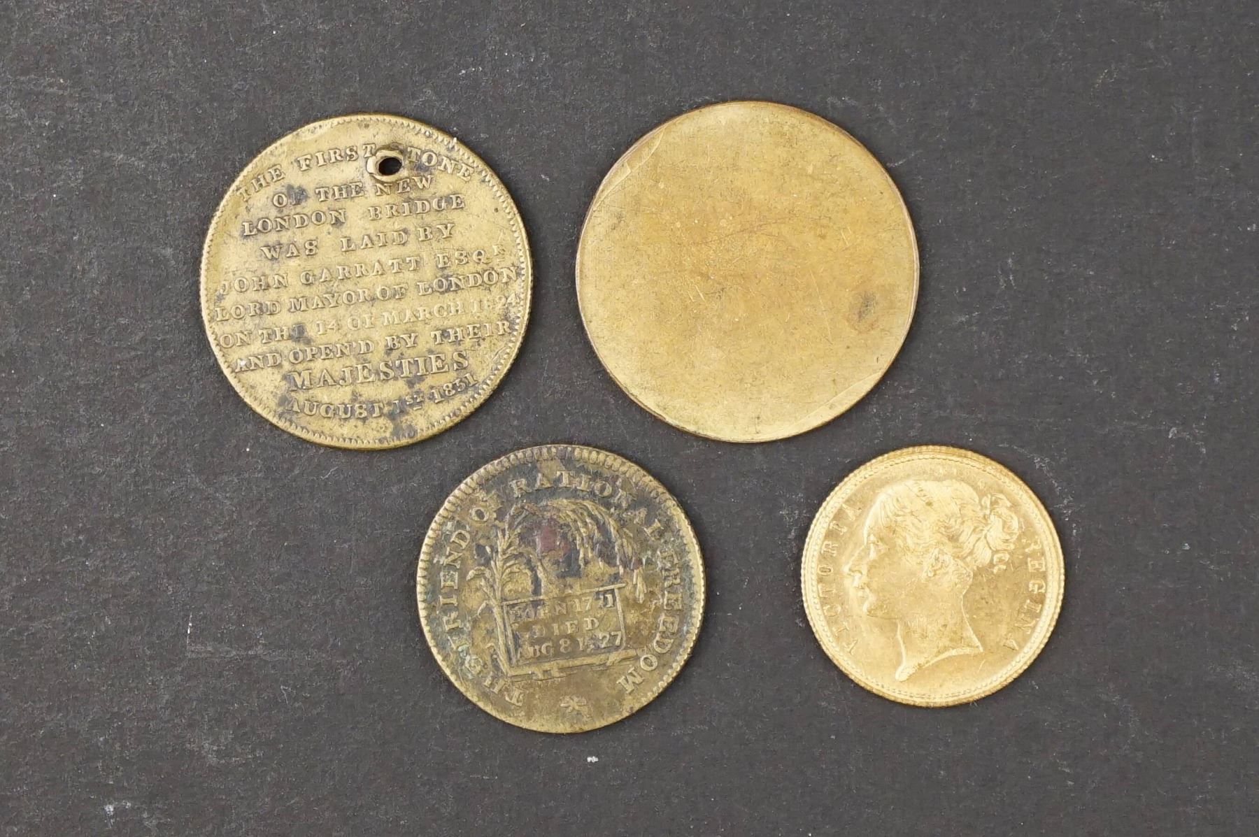 1) Appears to be silver, 15 mm, 1.5 grams.GEORGIVE III DEI GRARIA Bust right Signature below bust, hard to read, perhaps PETTE? Reverse: PEACE & PLENTY around a basket of corn, VF. 2) Bronze medalet 24 mm, 5,4 grams. 1827 George Canning, Prime Minister, memorial. VG. 3) Brass, 28 mm, 6.8 grams. Pierced. Opening of London Bridge 1851. 4)Bronze 19 mm, 1.7 grams. Obv: Queen Victoria. Rev: Habsburg Eagle Spiel market? F-VF. 5) Brass, 24 mm, 5.5 grams, Uniface, copy of the reverse of a double sovereign, with date of 1823. 6) Another Victoria? Habsburg Eagle Brass, 19 mm, 1.7 grams, BU. 7) Bronze, 23 mm. 3.4 grams, pierced. Obverse: Bust of William IV 1831. Reverse: Robert Raikes, founder of Sunday Schools. 8) 20mm 4.5 gr, copy of Waterloo medal gilt copper Bars soldered both sides.