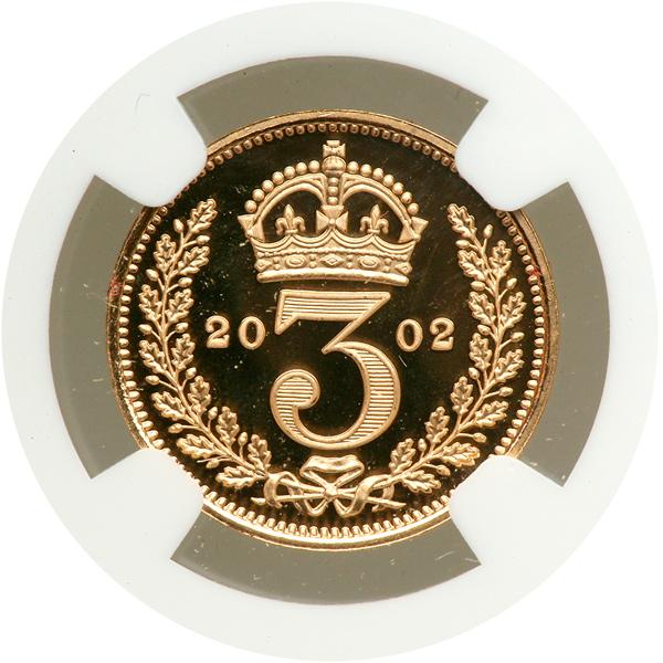 Great Britain. Maundy Set struck in 22ct Gold, 2002. Elizabeth II, 1952-. Obverse: Mary Gillick's traditional young portrait of the Queen facing right. Reverse: Single crowned numeral within wreath signifying, denomination. This is an exquisite set which is normally only available in the 13-coin 2002 Golden Jubilee collection. Some of the Maundy coins in the larger gold collection have the Queen's features imperfectly struck up, but this is a superb and fully detailed group. Certainly the only date of gold Maundy Set available for less than $30,000! Lot of 4 coins. NGC graded Penny, Proof 69 Ultra Cameo; 2 Pence NGC graded Proof 70 Ultra Cameo; 3 Pence NGC graded Proof 66 Ultra Cameo; 4 Pence NGC graded Proof 69 Ultra Cameo.