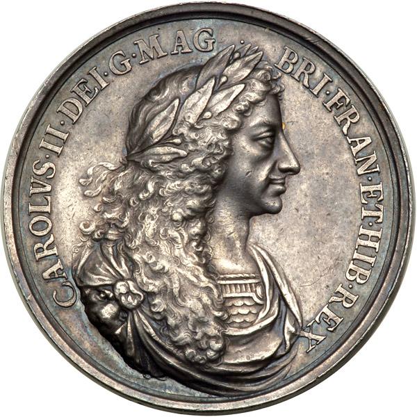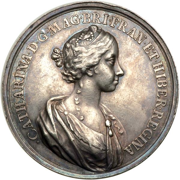 Great Britain. Medal, 1662. Med. Ill. I. p.489, 111 (Pl XLVII, 1). Silver. 43.4 mm. By Waller. Charles II. " The Golden Medal". Obverse: Laureate bust of Charles II right. Reverse: Bust of Catherine right. Minor edge bump. Toned. About Extremely Fine.