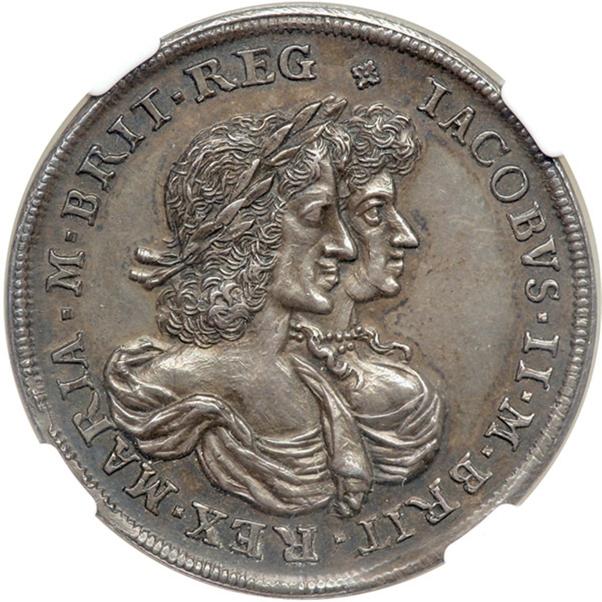 Great Britain. Medal, 1688. Woolf-1:4b; MI-629, 49. Silver 18.8 grams. 35 mm. Unsigned. Birth of Prince James. Conjoined busts of James II and Mary, facing right. Reverse: Map of the British Isles marked ANGLI, SCOTIA, HIBERNIA, with rain in the West and Sun in the East. Toned. NGC graded MS-63. .