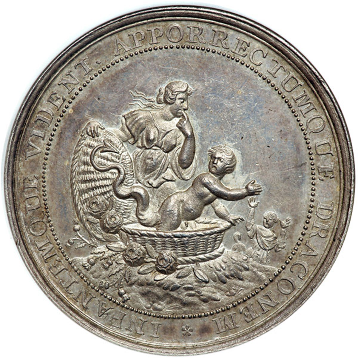 Great Britain. Medal, 1688. Woolf-2:1; MI-631,53. Silver. 46.2 grams. 49.1 mm. by Unsigned, Holland. Birth of Prince James Satirized. Pallas committed to the care of the three daughters of Cecrops. The three daughters represent England, Scotland and Ireland. Reverse: A withered rose-bush with two faded flowers represents the King and Queen, who generally believed, would never have children. Steel gray toning. NGC graded MS-63.