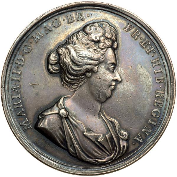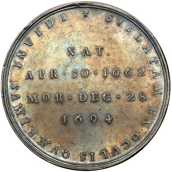 Great Britain. Medal, 1694. Med Ill. II.p. 111,343. Silver. 49.5 mm. By James and Norbert Roettier. Struck at the mint at the Tower. William and Mary. On the Death of Mary. Obverse: Bust of Mary right, hair bound with fillet. Reverse: Legend. Edge filed. Toned. Very Fine.
