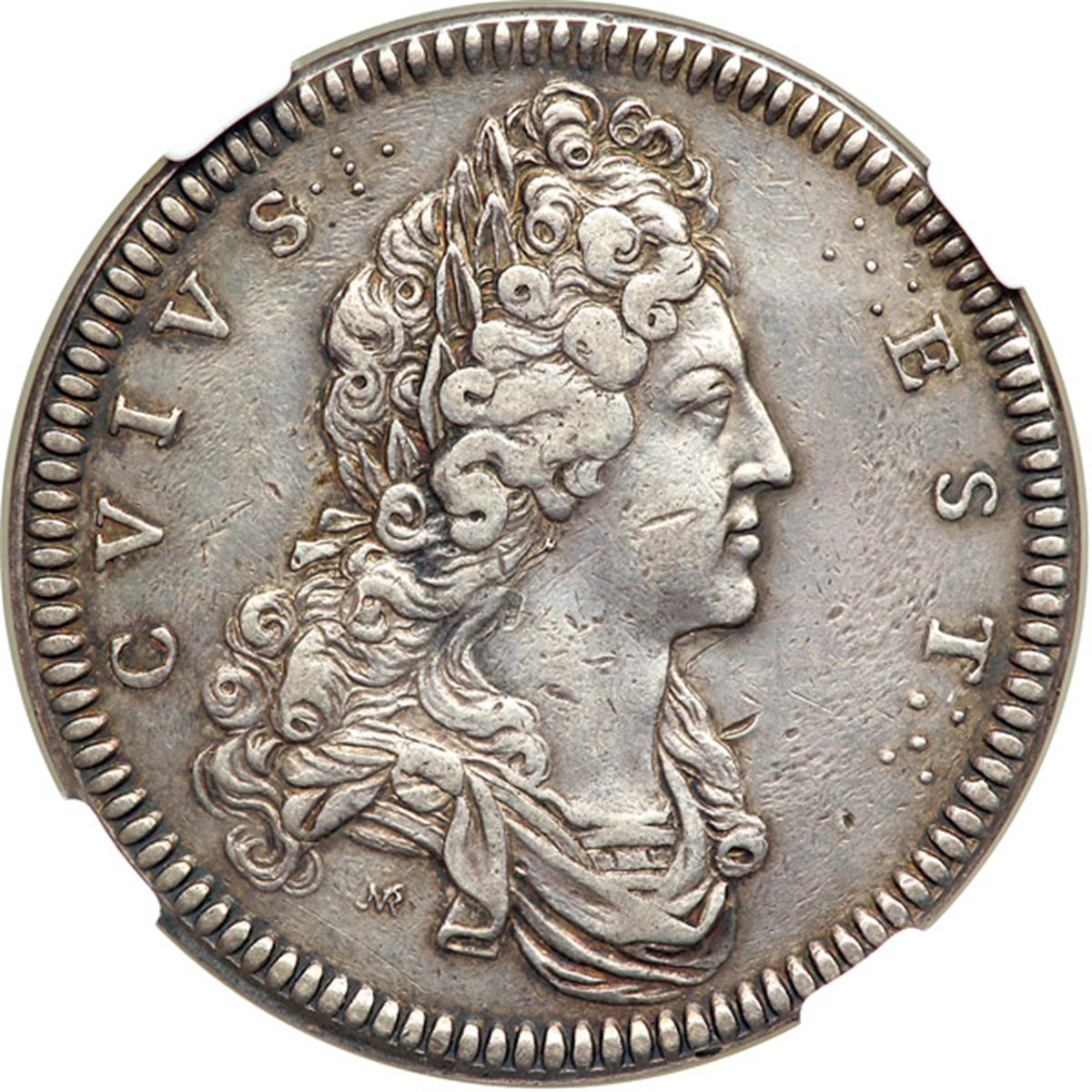 Great Britain. Medal, 1708. Woolf-23:1a; MI-312, 133. Silver 19.7 grams. 37.8 mm. by N. Roettier. France. James (III), 'Elder Pretender'. Laureate bust of James right. Reverse: Ships at sea surrounding a map of British Isles. NGC graded Extremely Fine, Details (Repaired).