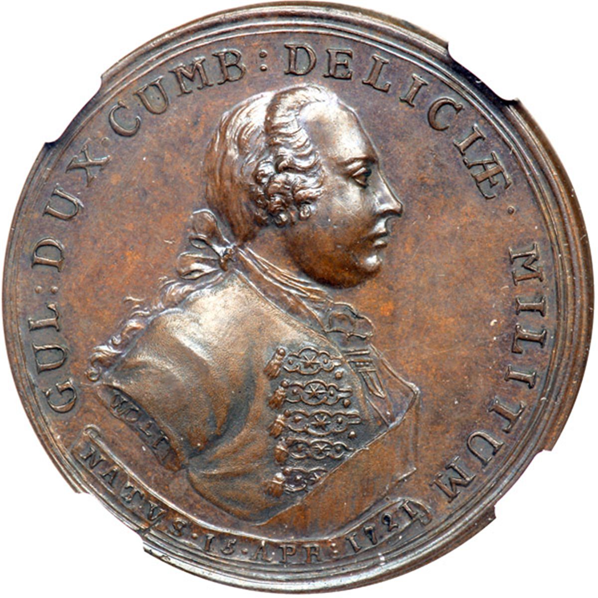 Great Britain. Medal, 1745. Woolf-52:1a; MI-605, 260. Bronze. 36.7 mm. Carlisle Taken, William Duke of Cumberland. Duke of Cumberland facing right. Reverse: Cumberland as a Roman warrior, attacks the Hydra of Rebellion. NGC graded MS-62 Brown.