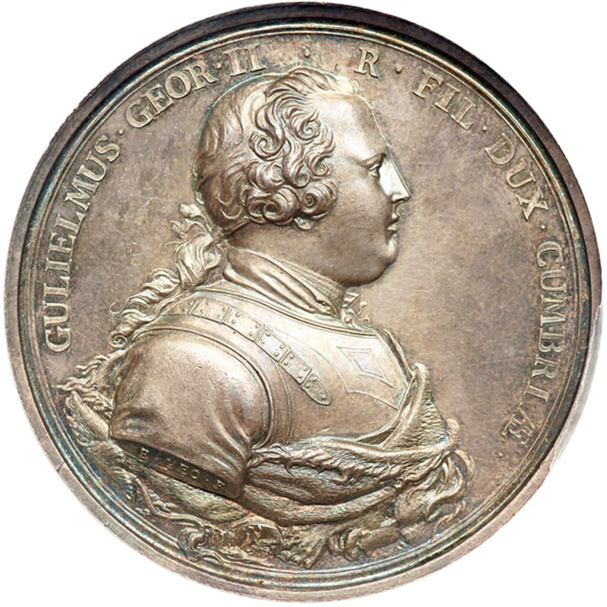 Great Britain. Medal, 1746. Woolf-55:2; MI-613,278; Eimer-604. Silver 51.6 grams. 50.8 mm. by R. Yeo. Battle of Culloden. Armored bust of George II right. Reverse: Britannia seated left, is assisted by the Duke, as Hercules, who tramples upon Discord. Beautiful old gray toning. NGC graded MS-63. .