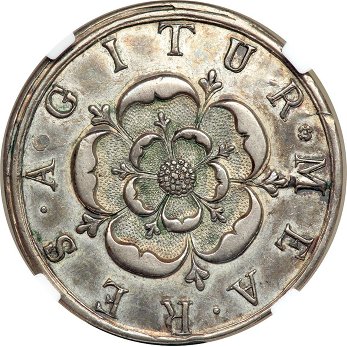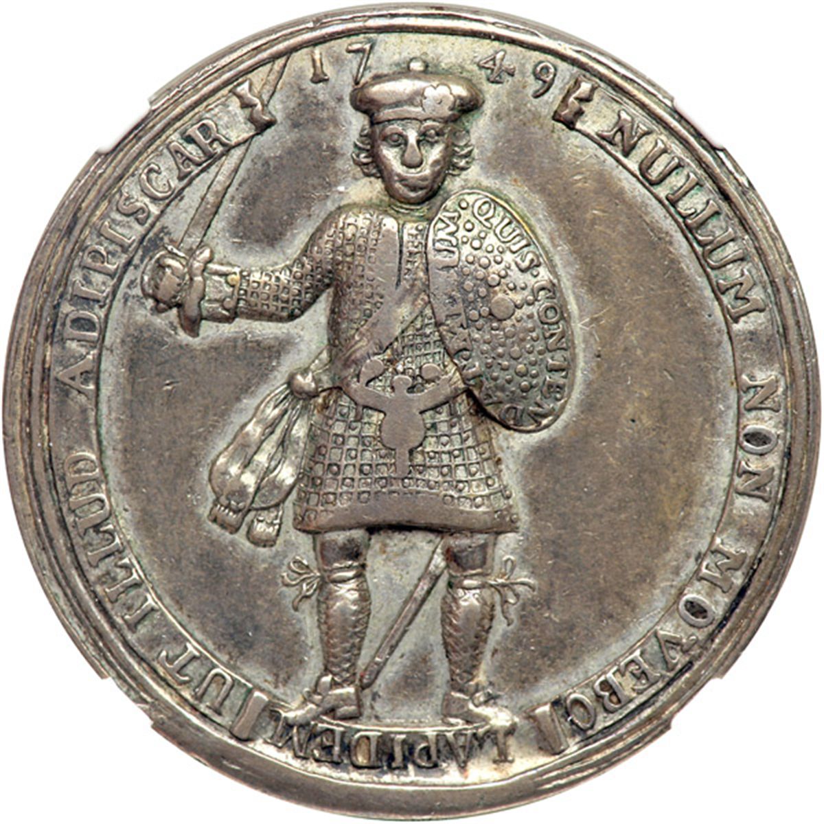 Great Britain. Medal, 1749. Woolf-61:1a; MI-655, 358; Eimer-624. Silver 17.3 grams. 31.3 mm. Unsigned. Legitimacy of Jacobite Succession. Prince Charles Edward. His expulsion from France. A Highlander facing holding sword and a shield. Reverse: An expanded rose. Rare. NGC graded EF-45.