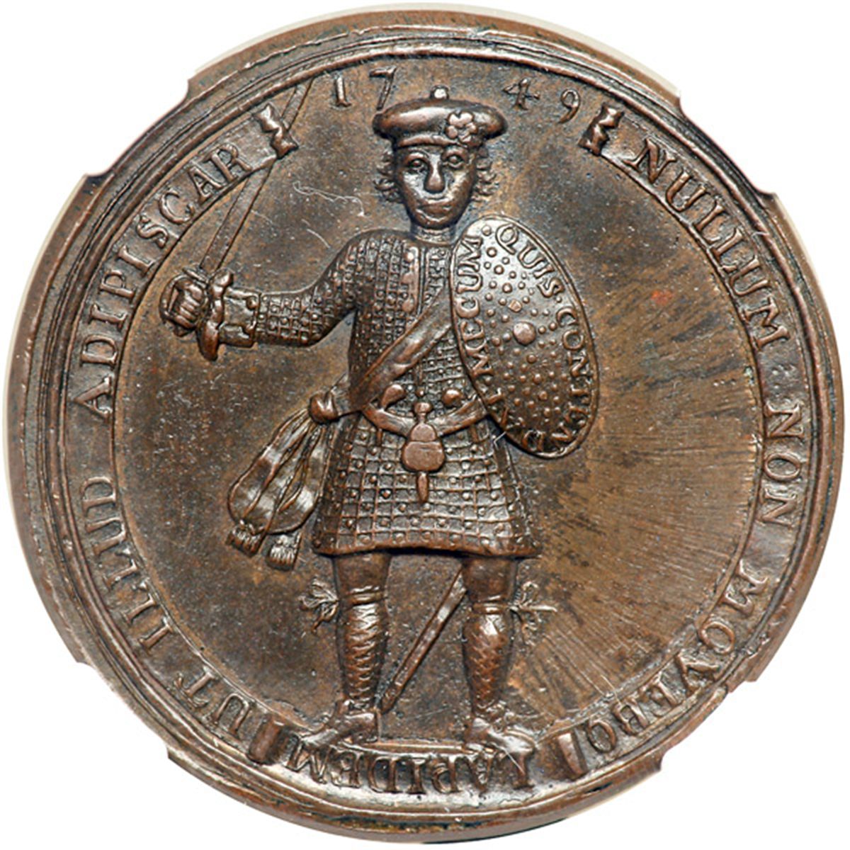 Great Britain. Medal, 1749. Woolf-61:1a; MI-655, 358; Eimer-624. Bronze. 31.7 mm. Unsigned. Legitimacy of Jacobite Succession. Prince Charles Edward. His expulsion from France. A Highlander facing holding sword and a shield. Reverse: An expanded rose. NGC graded MS-63 Brown.