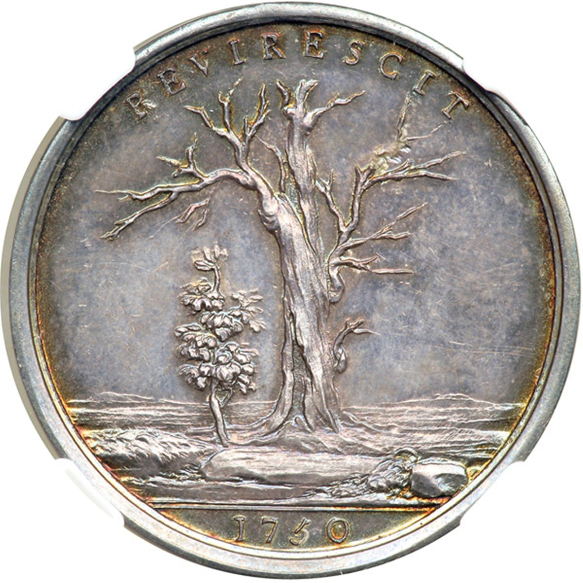 Great Britain. Medal, 1750. Woolf-62:1; MI-655, 359; Eimer-625. Silver 18.9 grams. 34.5 mm. by Roettier and Pingo. Prince Charles, Oak Society. Claims of Stuarts Revived. Bust of Charles right. Reverse: A leafless oak-tree, with a sapling springing from its root. Beautifully toned. NGC graded MS-65.