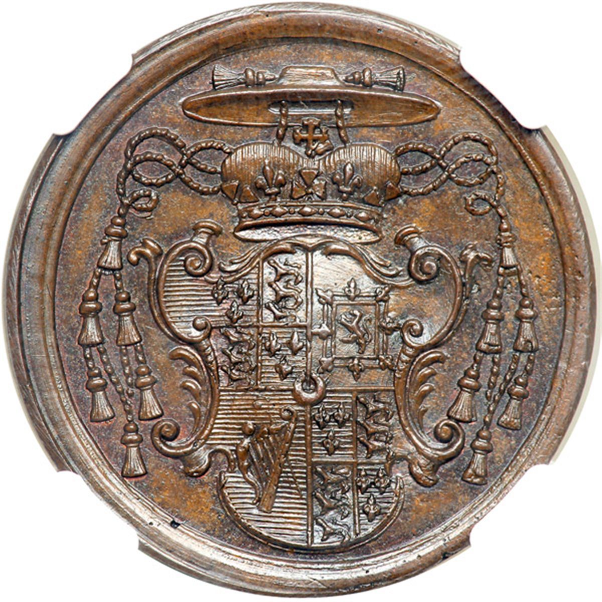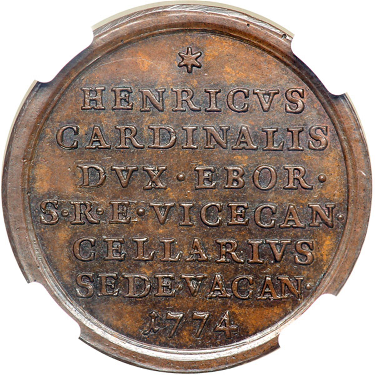 Great Britain. Medal, 1774. Woolf-72:1; BHM-196. Bronze. 28.8 mm. Unsigned. Death of Pope Clement XIV. Arms of Henry, Cardinal, Duke of York. Reverse: Inscription. NGC graded MS-65 Brown.