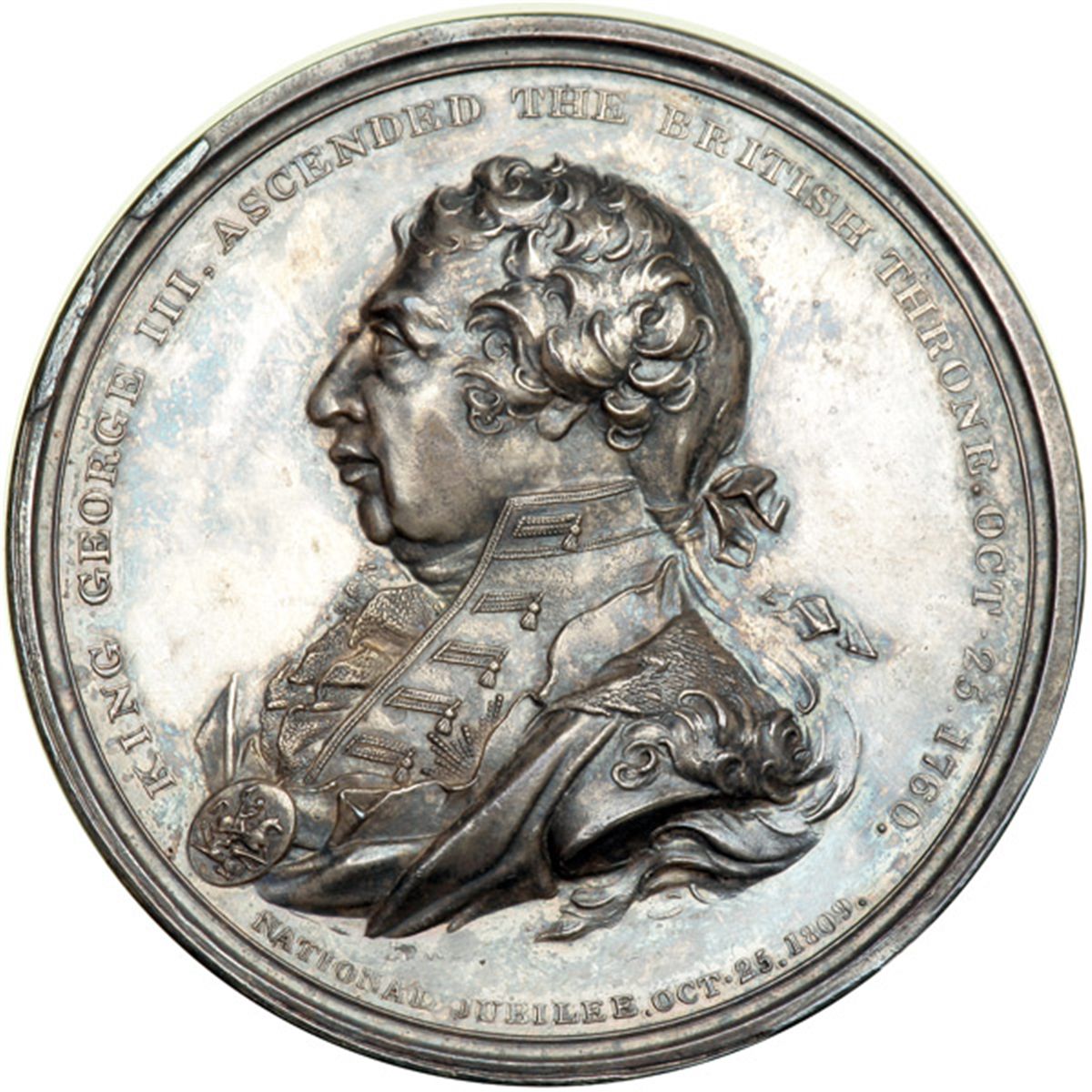 Great Britain. Medal, 1809. BHM-652. Silver. 52 mm. George III. The fiftieth year of his Reign. Draped bust of King wearing Order, left. Reverse: Angel seated upon clouds beneath rays amid attributes of Time (foot on skull,etc). Toned. In jumbo holder. NGC graded MS-63.