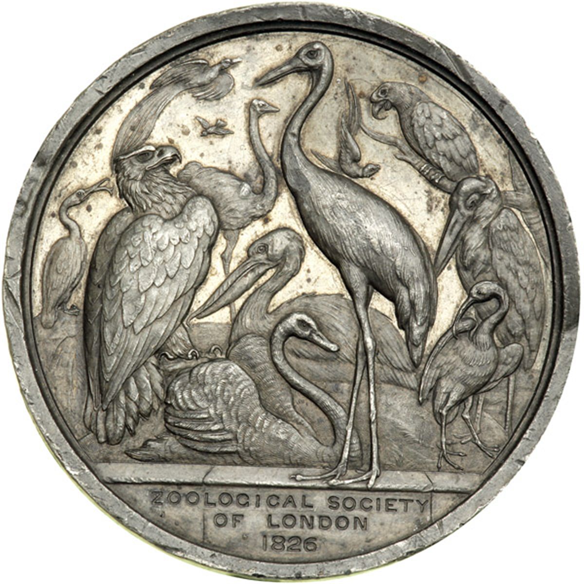 Great Britain. Medal, 1826. BHM-1272; Eimer-1187. Struck in White Metal. 75 mm. by B Wyon, after T. Landseer. Zoological Society of London. A group of twelve birds. Reverse: A group of seven animals. In jumbo holder. NGC graded About Uncirculated, Details (Bent).