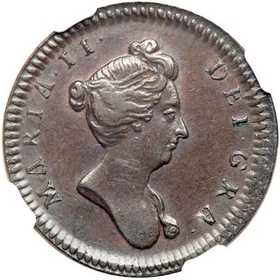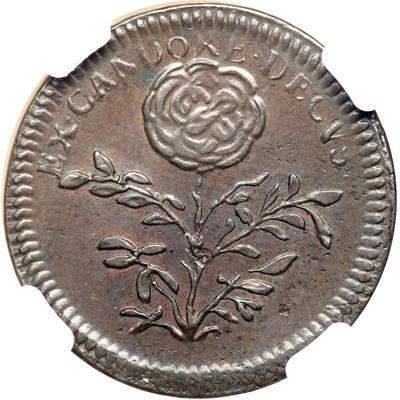 Great Britain. Medal ND (1689). Med Ill. 695,93. Struck in copper. 23.5 mm. William and Mary, 1688-1694. Bust of Queen Mary II right, hair bound with fillet, in knot behind, lovelock, no drapery. Reverse: Rose branch. In a new 4 prong NGC holder. NGC graded EF-40 Brown.