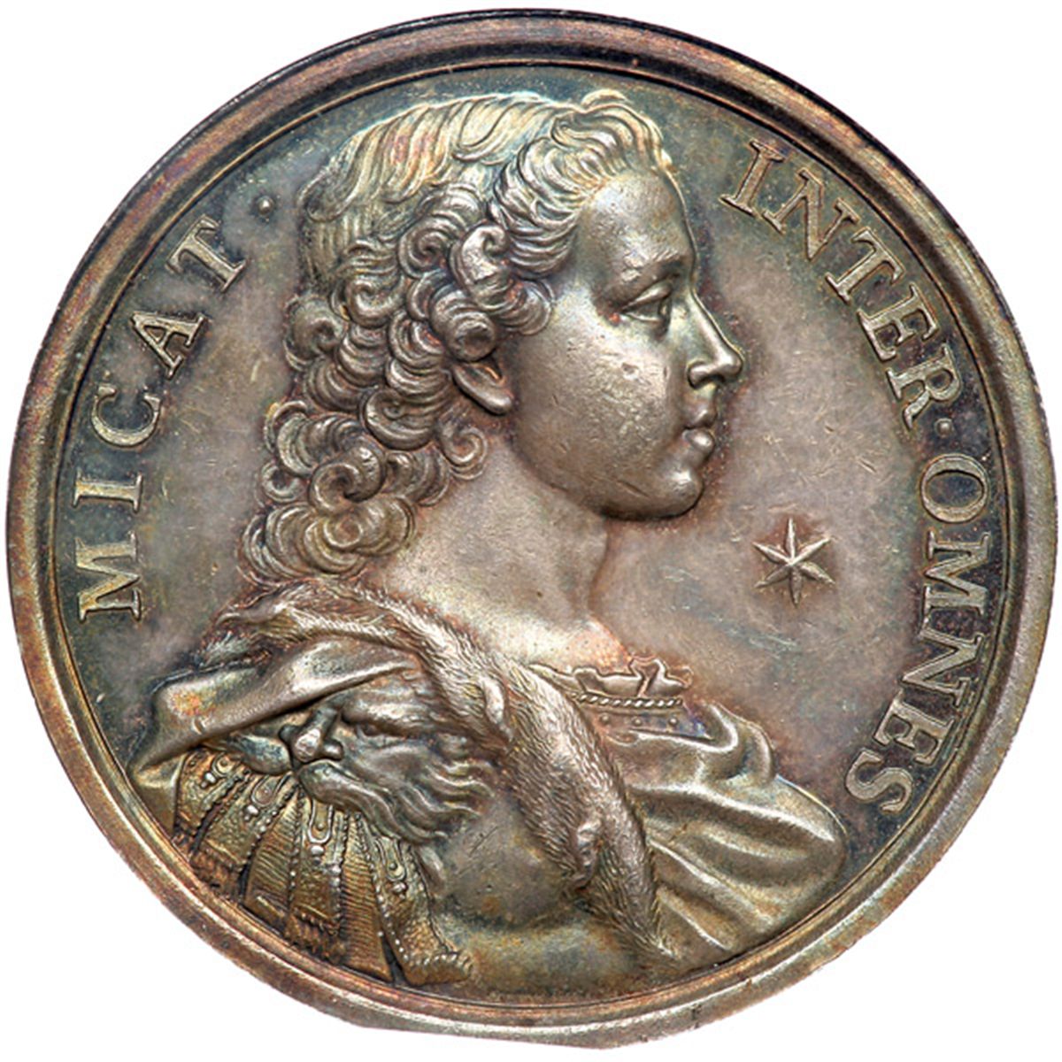 Great Britain. Medal, ND (1729). Woolf-43:1; MI-492, 34; Eimer-521. Silver 39.1 grams. 41.8 mm. by O. Hamerani, Rome. Prince Charles and Prince Henry: Legitimacy of Jacobite Succession. Bust of Charles right, armored and draped, a star before him in the field. Reverse: Bust of Henry left, armored and draped. Lovely old deep iridescent toning. NGC graded MS-63.