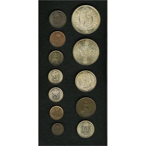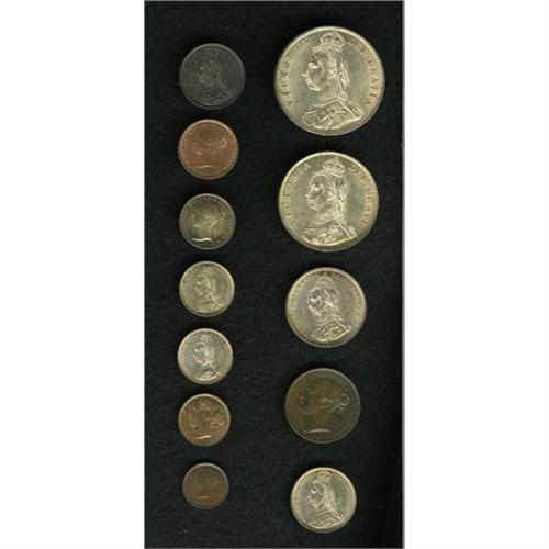 <B>Nice Victorian assortment:</B></I> Quarter Farthing 1839, Choice brown Unc.; Third Farthing 1881, Choice reddish Unc.; Half Farthing 1844, Choice R&B Unc.; Farthing 1847, pleasing brown Unc.; Britannia 4d 1854, Choice iridescent toned Unc.; Threepence 1887, nice Unc. (2 pieces); Sixpence 1887 Value reverse, nice Unc. (2 pieces); Shilling 1887, BU; Florin 1887, nice BU; Halfcrown 1887, nice BU.<BR><BR><b>Shipping:</b> Coins & Currency (<a target="_blank" href="http://www.heritageauctions.com/common/shipping.php">view shipping information</a>)