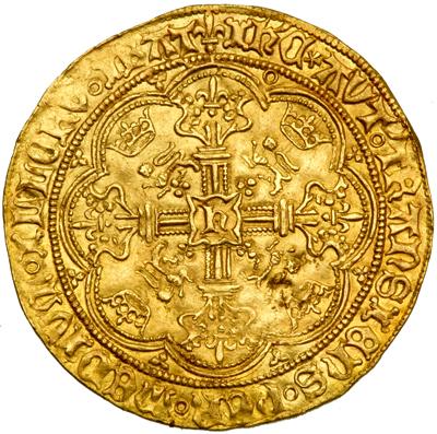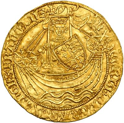 Great Britain. Noble, ND. S.1799; Fr-112. Henry VI, first reign, 1422-1461. London mint. Annulet issue. Obverse: King standing in ship facing, holding sword and shield. Reverse: Floritated cross with lis at ends, h in center and annulet in first spandrel. A wonderfully round flan, an abundance of original luster and a magnificent portrait are all the features of this large medieval gold coin. So difficult to find in high grade, top quality specimens are now practically unavailable. NGC graded MS-61.