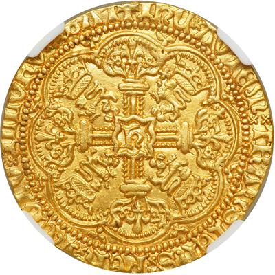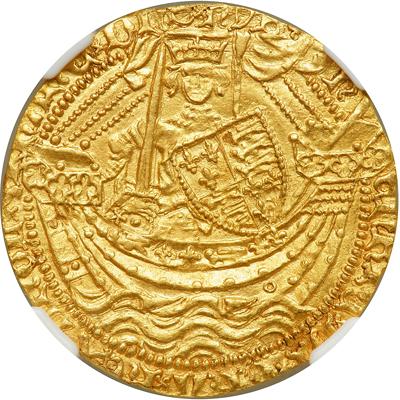 Great Britain. Noble, ND. S.1742; Fr-109. Henry V, 1413-1422. Obverse: King standing facing in ship, bearing sword and shield. Broken annulet on side of ship. Reverse: Floriated cross with lis at ends, large E in center. As is often the case, this is struck on a smaller diameter flan than the gold Nobles of other reigns. The piece is crisply made with well struck lettering, sharp design detail, and a good portrait. Nice original surfaces. All the gold coins of this brief reign are now difficult to find in any grade. High quality Nobles of Henry V are quickly disappearing. In a new NGC 4 prong holder. NGC graded MS-62.