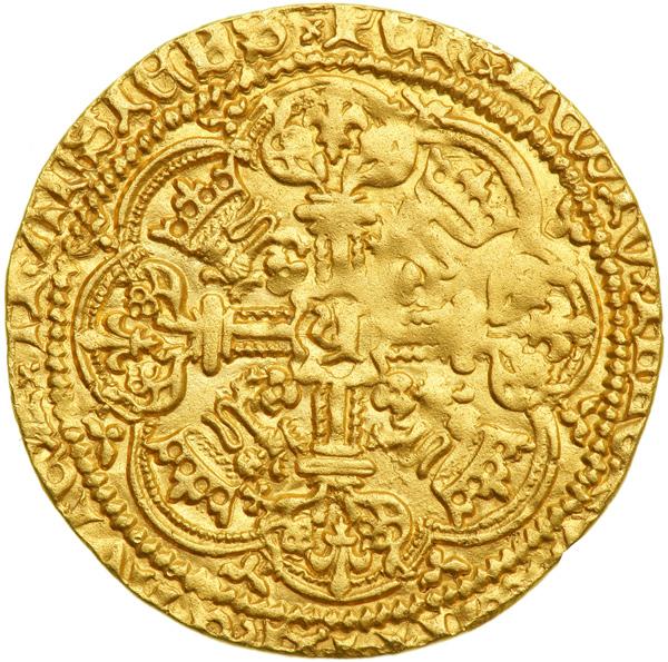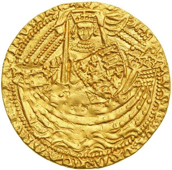 Great Britain. Noble, ND. S.1742; Fr-109. Henry V, 1413-1422. Broken annulet by the side of ship. King standing in ship facing, holding sword and shield. Reverse: Ornamental cross. Minor surface porosity, clipped and mount removed. NGC graded Extremely Fine, Details.