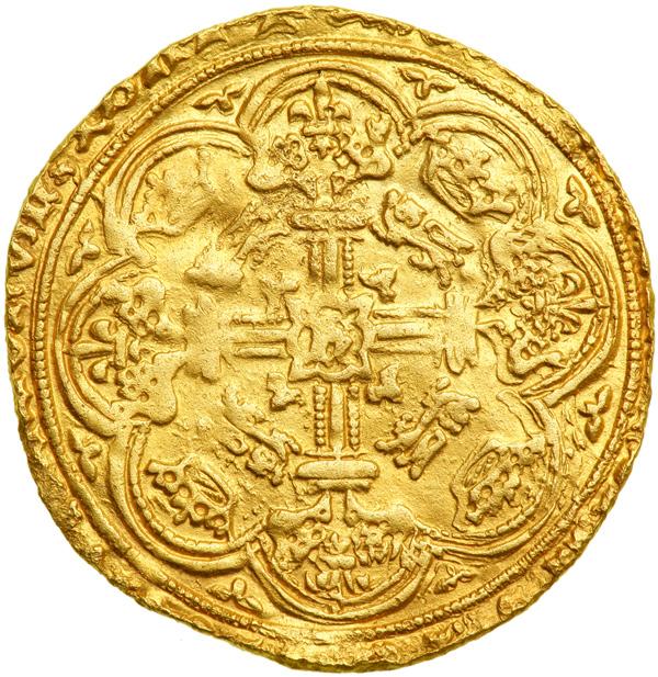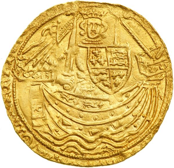 Great Britain. Noble, ND. S.1818? 6.19 grams. Henry VI, First Reign, 1422-1461. Ruler in ship, flag at stern. Reverse: Ornamental cross with "h" in center. Surface porosity, clipped edges with legends not visible. Very Fine.