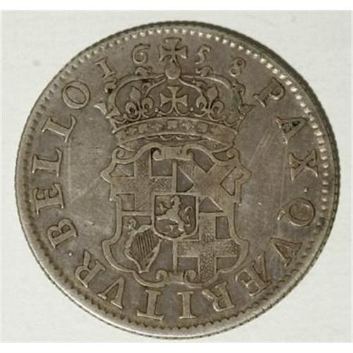 <B>Oliver Cromwell Shilling 1658,</B></I> S-3228, Fine, a smooth but evenly worn yet never abused piece, with truly appealing medium gray toning. Rarer in this grade than a coin two grades higher, proving that Cromwell's silver did in fact circulate even after he passed ungraciously from the scene.<BR><BR><b>Shipping:</b> Coins & Currency (<a target="_blank" href="http://www.heritageauctions.com/common/shipping.php">view shipping information</a>)