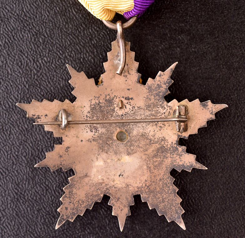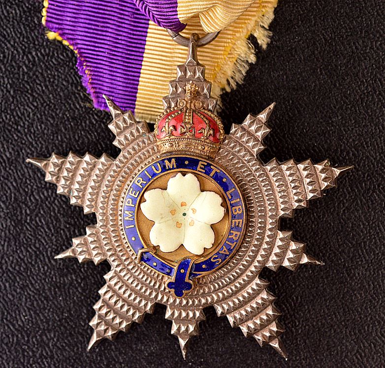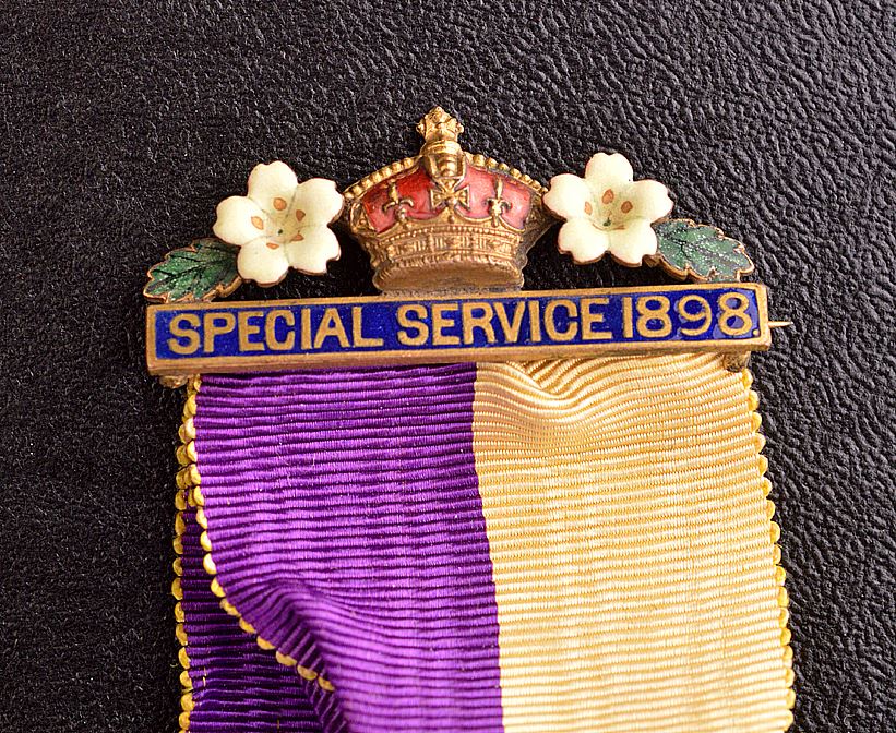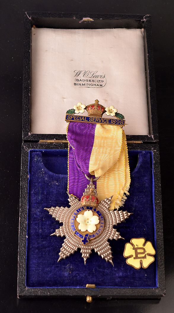 Great Britain, Political Order of the Primrose League, Badge, in 10 pointed star, silver, with enamel, 56mm x 56mm, with purple and yellow ribbon, enamelled bar, with "Special Service 1898", VF, in box of issue; included is a lapel pin, yellow enamel, "PL" for Primrose League, Fine; by W. O. Lewis, Birmingham