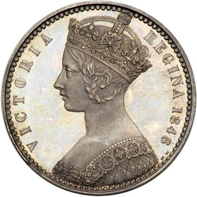 Great Britain. Pattern Florin, 1848. ESC-886. Plain edge. Obverse: Crowned portrait of Victoria facing left, with hair braided and ornate gothic-style bodice VICTORIA REGINA 1848. The words DEI GRATIA omitted from the obverse legend, prompting the nickname 'Godless' Florin. Reverse: Crowned cruciform shields and legend ONE FLORIN - ONE TENTH OF A POUND. Choice mint state with wisps of golden blue toning across the detailed Gothic bust. An exceptionally beautiful example of this 160 year old pattern which truly began the British Florin series. NGC graded Proof 64.