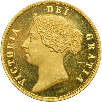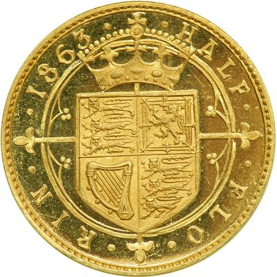 Great Britain. Pattern Gold Half Florin, 1863. Similar to ESC-1376 (ESC-1377 on NGC holder). Not in Wilson and Rasmussen. Plain edge. By Wiener and Taylor. Victoria, 1837-1901. Coronetted head of Queen left. C.W. on neck. Legend: VICTORIA DEI GRATIA. Reverse: Crowned square-topped shield, in tressure over cross. Legend. HALF. FLO. RIN.1863. Presumably Unique. NGC graded Proof 64 Ultra Cameo.