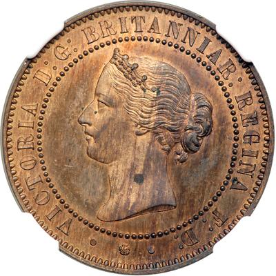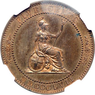 Great Britain. Pattern Halfpenny, 1857. Peck-1974; Freeman-678. Bronze. 25 mm. Officially produced by the British Royal Mint for a proposed decimal coinage. Victoria, 1837-1901. Obverse: Portrait of Queen wearing jewelled diadem left, within circle of dots. VICTORIA D:G: BRITANNIAR : REGINA F:D: 1857 around. Reverse: Britannia seated within circle of dots. FIVE CENTS above MDCCCLVII below. Another important experimental piece probably engraved by James Wyon. The design is delightful and the condition superb. In a new NGC 4 prong holder. NGC graded Proof 63 Red & Brown.